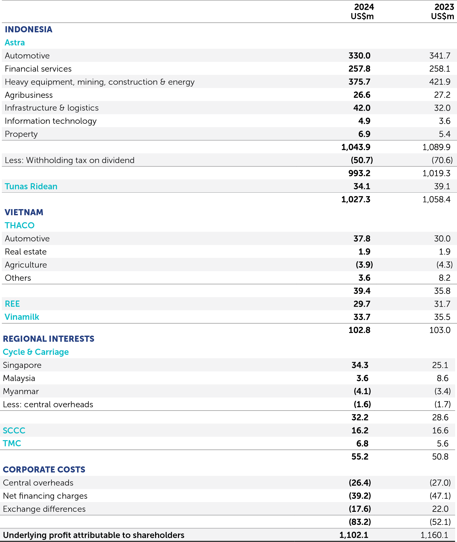 The overall JC&C portfolio demonstrated earnings resilience in 2024, although the Group was affected by foreign exchange differences which led to a 5% decline in underlying profit to US$1,102 million.